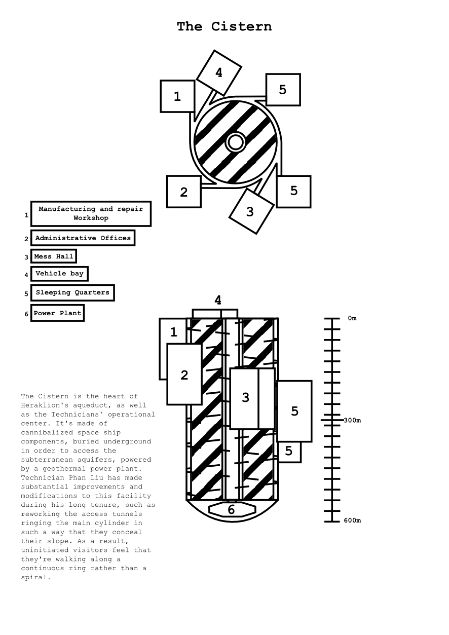 I think I’m getting better at these. Here’s another simple map for my Heraklion campaign. The Cistern is the home of the Technicians, who maintain Heraklion’s various systems.