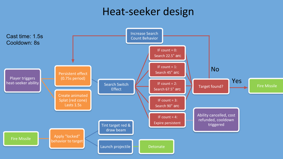 Players trigger the lock-on phase, spawning a narrow search area that expands over time, pulsing a target search. This flow is described in the following slide: