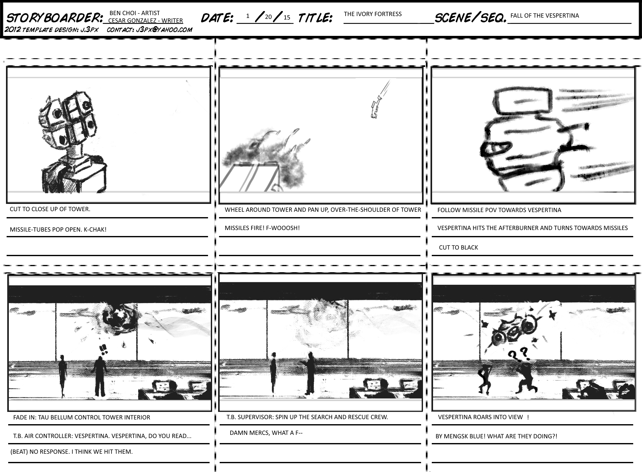 I wrote this script as the intro cinematic to a series of maps I was building in the SC2 editor. This draft got turned into a storyboard (displayed here). It introduces the player to a couple of characters, their current situation (that would lead to one the maps) and their personality. This, of course, is all part of my constant experimentation.