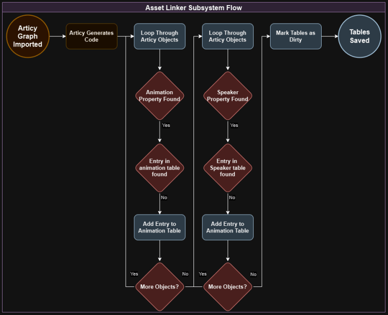 As a result, I created a subsystem called the Asset Linker subsystem. This subsystem ingests the updated Articy objects the plug-in uses to add entries in the Animation and Speaker datatables.