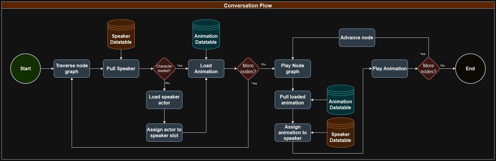 I needed a wrapper that would rely on other data sources to bind each node to an animation and speaker. I did this through the project’s custom game mode, giving it a reference for a singleton instance of the Flowplayer, along with two other data sources: an animation datatable and a speaker datatable.