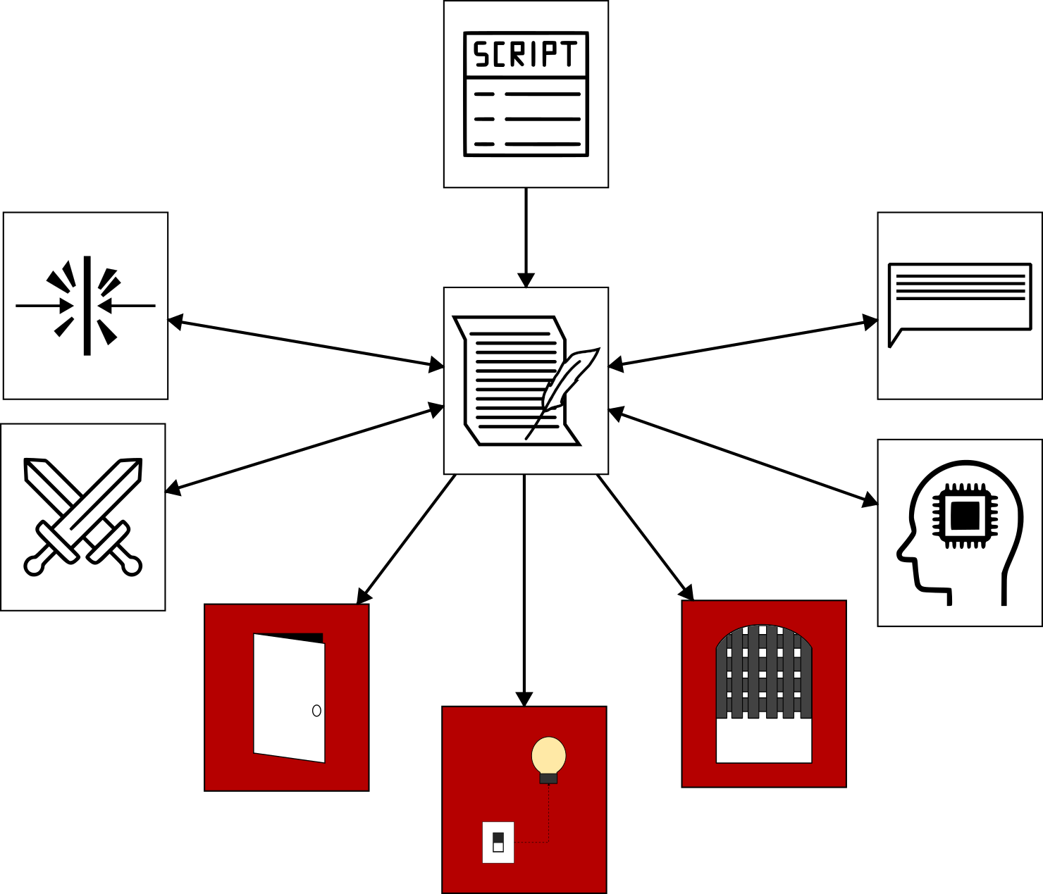However, during a game’s development phase, the quest system’s primary purpose is to allow designers to create the game’s rules with as much flexibility as possible. This is why commercially available game engines will have a distinct scripting language or toolset that’s separate from the game’s source code, operating a higher layer of abstraction. This is also the layer that quest systems most often operate at. That scripting framework is there to allow designers to create the game states, rules, and transitions that will shape the game’s experience.